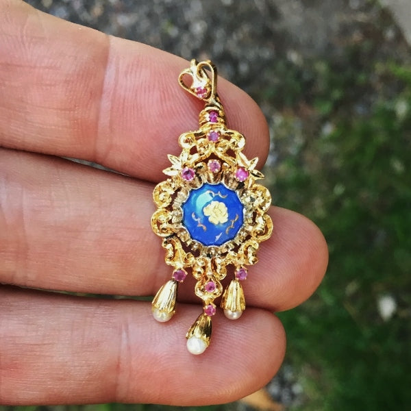 Antique! Georgian Period 18 kt Pearl, Ruby & Enamel Pendant GL
